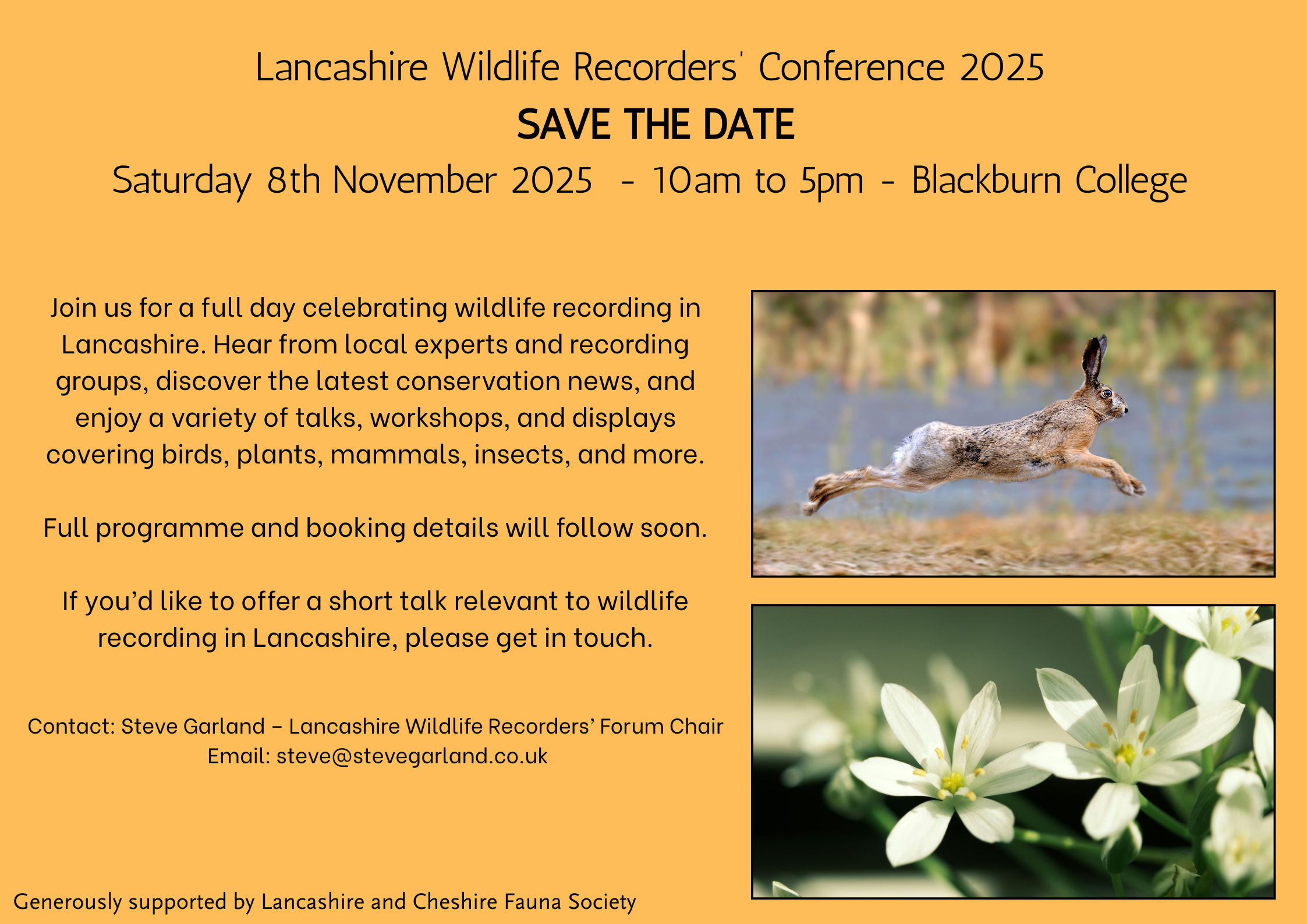 The Lancashire Wildlife Recorder’s Conference 2025 will take place again this year at Blackburn College on Saturday 8th November 2025 10am – 5pm. Full booking details will be communicated soon.